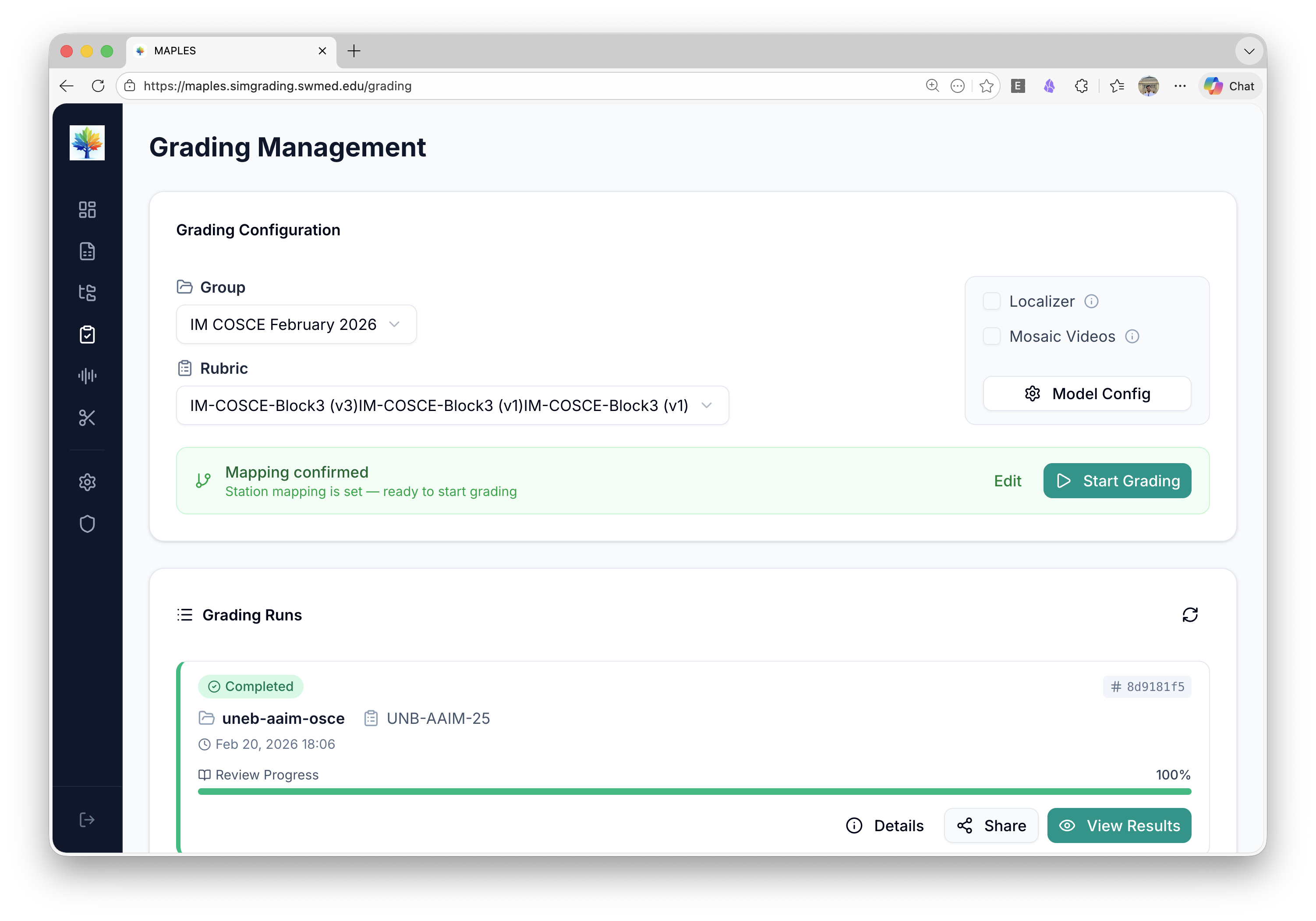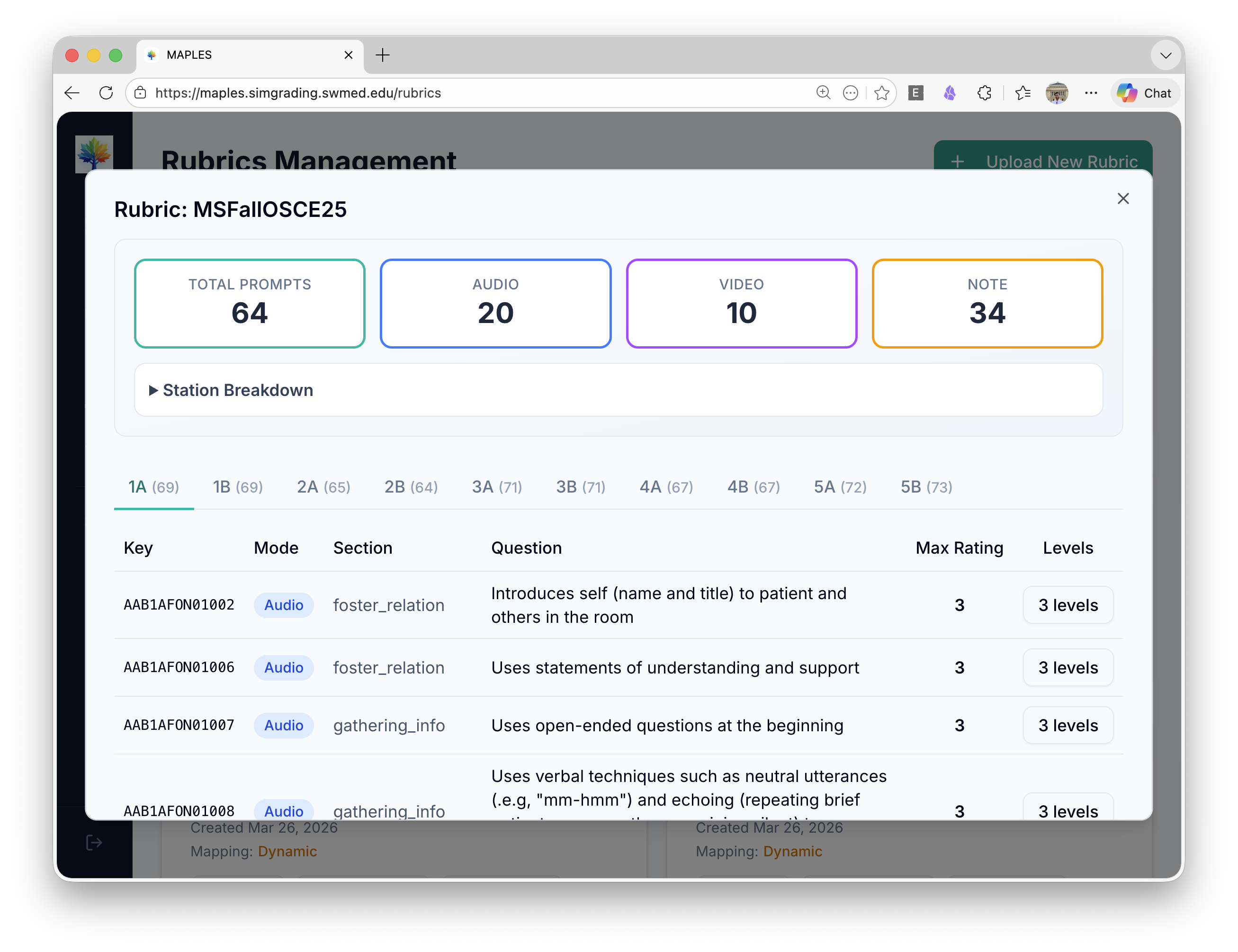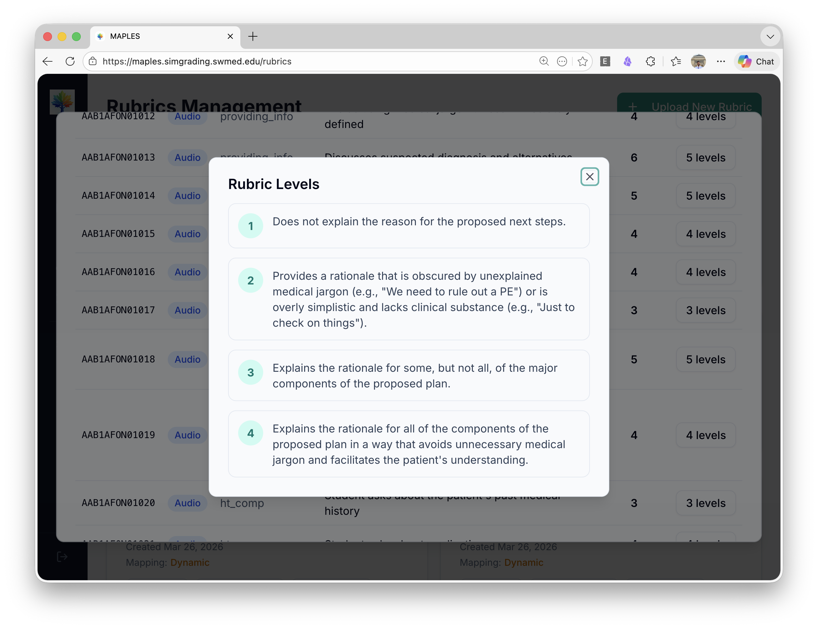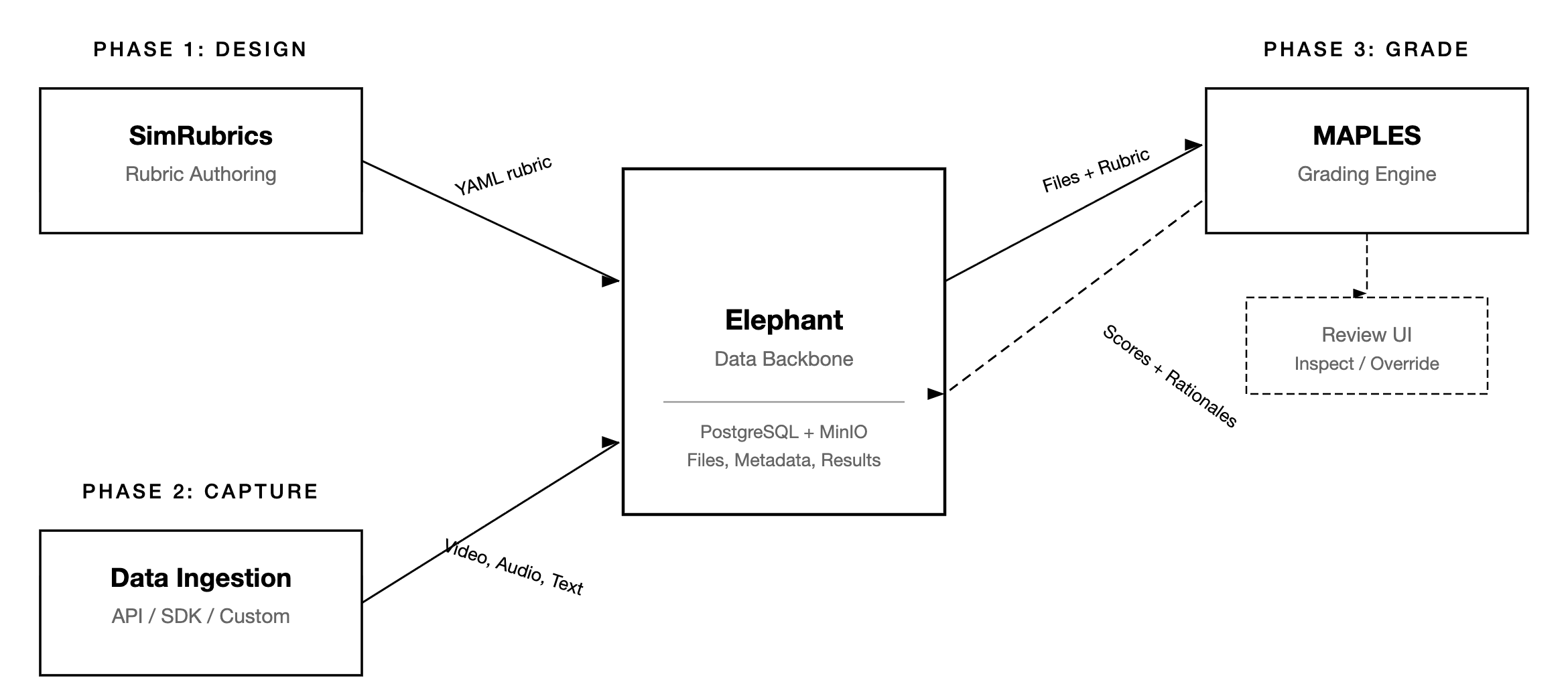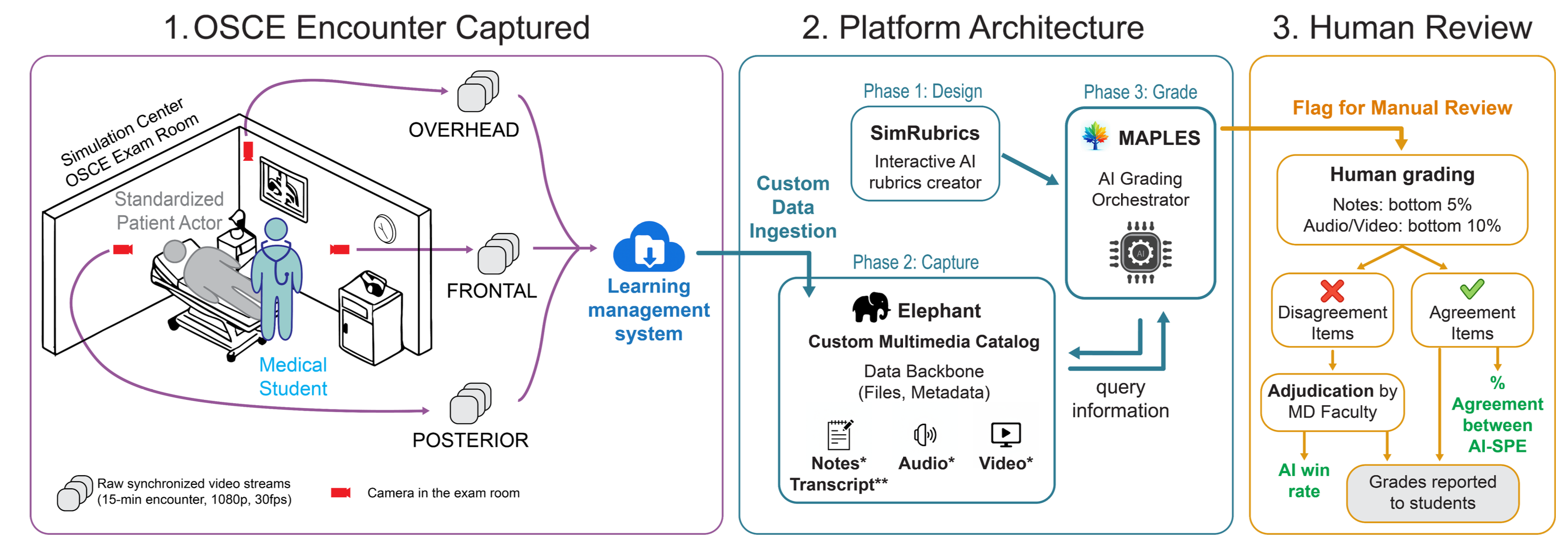 Screenshots, architecture diagrams, and published figures from the MAPLES AI grading platform and the OSCE simulation environments it serves.